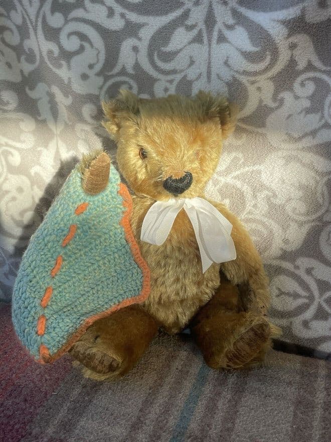 He is covered in bountiful quality toffee coloured mohair, and also has his very own knitted blanket to snuggle which attaches to his wrist.